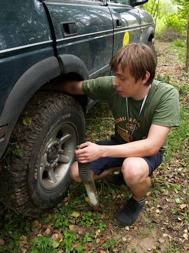 Dzieciaki czekały na nasz przyjazd o 10 na palcu tak jak to było uzgodnione przez Chimka z dyrektorka ośrodka. Szybkie losowanie załóg i rozdanie pakietów startowych (koszulki, jedzenie, roadbooki, zestawy przydasiek) i odliczanie. Załogi startowały z opóźnieniem, żeby każdy jechał jak najbardziej indywidualnie. Pierwsze kilometry to kluczenie po ulicach Szczecinka, potem już tylko szutrówki i drogi leśne. Na trasie było dużo zadań specjalnych jak np. jazda z zamkniętymi oczami po slalomie dzięki nawigacji pilota przez CB z "orlego gniazda". Ważna była tu komunikacja miedzy pilotem i kierowcą oraz zdecydowanie podejmowanych decyzji. Slalom kończył się słupkiem z kubeczkiem wody, który należało tylko dotknąć. U mnie w samochodzie okazało się, że na dojeździe do tego zadania urwałem gdzieś amortyzator. Wiec w oczekiwaniu na swoją kolejkę zająłem się demontażem zbędnego już wyposażenia.
